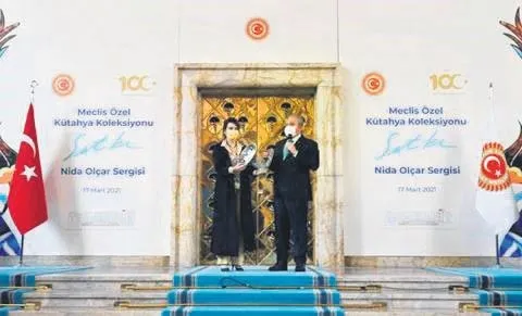 Nida, Başkan ve konuklarına sergiyi gezdiriyor ve minderden tabloya, kol düğmesinden yaka mendiline, çeşit çeşit objeler üzerine işlenmiş geleneksel ve çağdaş Kütahya çini desenlerini anlatıyor.