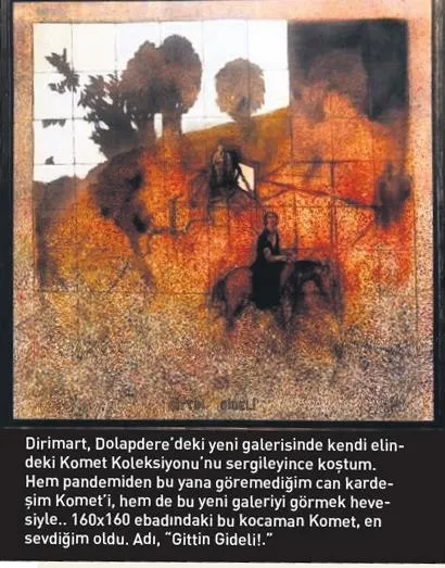 Pandemi yüzünden Paris'e gidememiş, Türkiye'de kalmış.. Dirimart patronu Hazer Özil zaten Komet koleksiyoncusu.. "Hadi çalış" demiş.. "Bütün yaptıklarını ben alıyorum.." Yani sergide satılık tek resim yok. Hepsi Hazer Bey'in koleksiyonu..