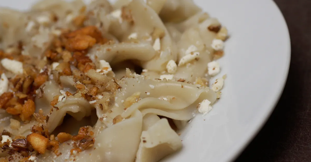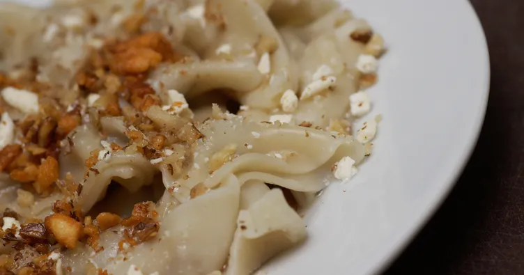 Büyük bir kaba biraz un, yumurta, su ve tuzu ekleyip yoğurun. Hamurun üzerini örtüp dinlendirin. İçini hazırlamak için; kıymanın üzerine soğanı rendeleyin ve maydanozu doğrayıp ekleyin. Karabiber ve tuzu ekleyip karıştırın. Hamuru ikiye bölün. Yufka gibi incecik açın. Büyük kareler keserek iç harçtan ekleyin. Katlayıp bu işleme devam edin. Mantıları kaynayan suya atın 10 dakika kadar haşlayın. Üzerine tereyağı ve pul biber kavurup dökün. En son olarak kıyılmış cevizleri serpin.