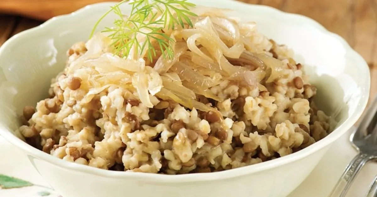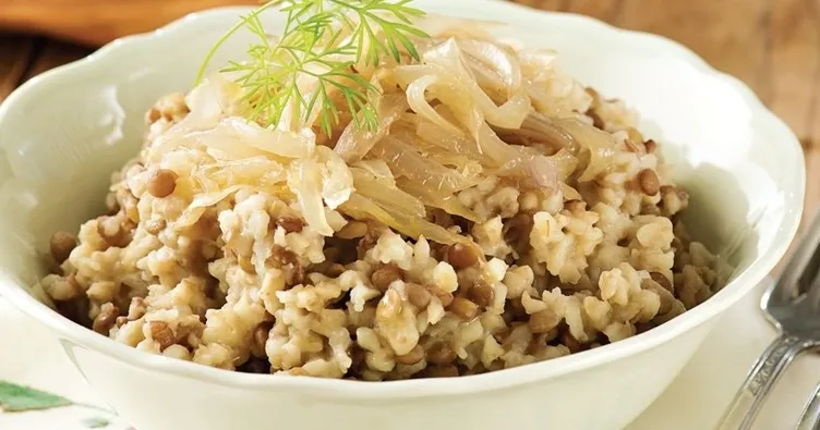 Mercimeği bir gece önceden üzerini iki parmak geçecek kadar suyla ıslatın. Ertesi gün süzüp üzerine 8 su bardağı su ve bir tutam tuz ilave edip kapağı kapalı olarak ocağa oturtun. Kaynayana dek harlı ateşte, sonra kısık ateşte yumuşayana dek haşlayın. Mercimek yumuşadığında içine yıkanıp süzülmüş bulgur, zeytinyağı ve tuz ilave edip karıştırın. Tencerede bulgurun iki parmak üstüne çıkacak kadar su olmalı. Azalmışsa kaynar su ilave edin ve bulgur yumuşayana dek karıştırmadan (yine gerekirse su ilave ederek) pişirin. Piyazlık doğradığınız soğanları bir tavaya alın. Üzerine zeytinyağını ilave edin. Yağ kızana dek harlı, daha sonra kısık ateşte, arada bir karıştırarak soğan şeffaflaşana dek yaklaşık 25-30 dakika kavurun. Pilavı servis tabağına aktarın. Üzerine yağıyla birlikte kavrulmuş soğanı döküp ikram edin.