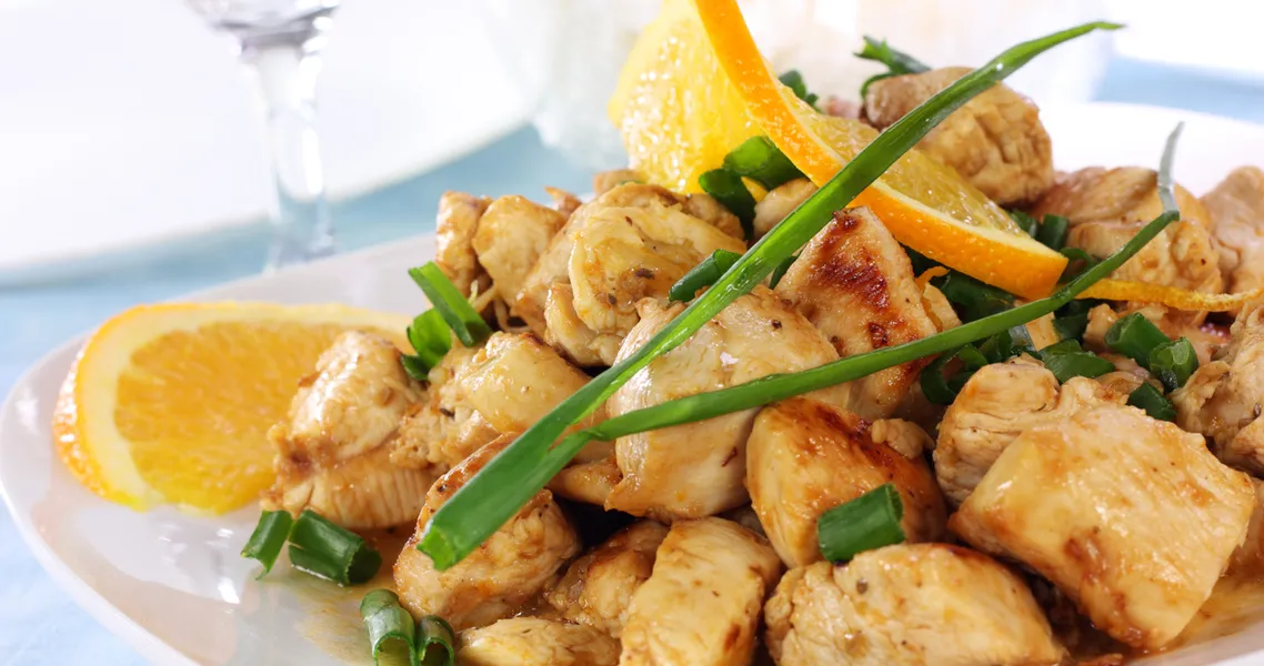 Öncelikle 3 adet portakalın suyunu sıkın. Kalan portakalların kabuklarını soyup küp doğrayın. 1 adet portakalın kabuğunun beyaz kısımlarını alıp ince doğrayın. Soğanı ince kıyın. Tozşeker ve suyu küçük bir tencereye alıp kısık ateşte koyu bir şerbet kıvamına gelene dek pişirin. Üzerine soğan, sirke ve portakal suyu ekleyin. Arada bir karıştırarak boza kıvamına gelene dek pişirin. Üzerine doğranmış portakal, portakal kabuğu, 2 çorba kaşığı tereyağı, zencefil ve tuz ekleyin. Suyunu yarı yarıya çekene dek pişirin. Tavuk göğüslerinden fileto çıkarın. Tereyağı ve sıvıyağı bir tavaya alıp filetoları önlü arkalı kızartın. Sıcakken üzerlerine karabiber ve tuz serpin. Servis tabaklarına alın. Portakallı sos gezdirin. Portakal dilimleri ile süsleyerek servis yapın.