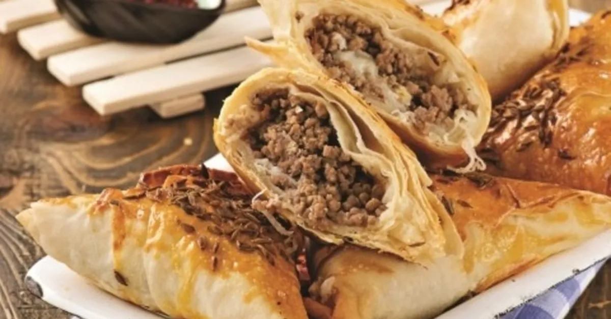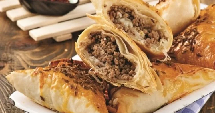 Yemeklik doğranmış soğanı 1 yemek kaşığı ayçiçeği yağında pembeleşene kadar kavurun. Kıymayı da ilave edip kavurmaya devam edin. Tuz ve baharat ekleyin. Kıyma kavrulunca kıyılmış maydanoz ekleyip ocaktan alın. Yufkalardan birini düz bir zemine serip eşit genişlikte 8 uzun şerit halinde kesin. Şeritleri bir fırça yardımı ile yağlayın. Şeritlerden birinin uç kısmına bir yemek kaşığı kıymalı harç koyun. Bir sağa bir sola doğru çevirerek üçgen şeklinde katlayın. Açılmasını önlemek için ucuna su sürün. Daha sonra yağlanmış tepsiye dizin. Tüm yufkalar bitinceye kadar işleme devam edin. Üzerlerine yumurta sarısı sürün ve arzuya göre kimyon tohumu serpin. Önceden ısıtılmış 180 derece fırında kızarana dek pişirin.