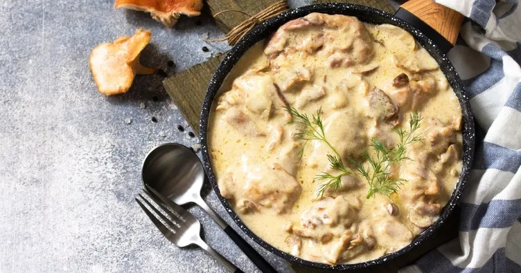 Yemeklik doğranmış soğanı zeytinyağında kavurun. Pulbiber ve karabiber ekleyip kavurmaya devam din. Küp doğranmış tavuk eti, kıyılmış mantar ve sarmısak ilave edip, mantar suyunu salıp hafif çekene dek pişirin. Su ekleyip, tuzunu ayarlayın ve kısık ateşte 30 dakika pişirin. Ocaktan almaya yakın krema ilave edip 5 dakika daha pişirin. Sıcak olarak servis yapın.