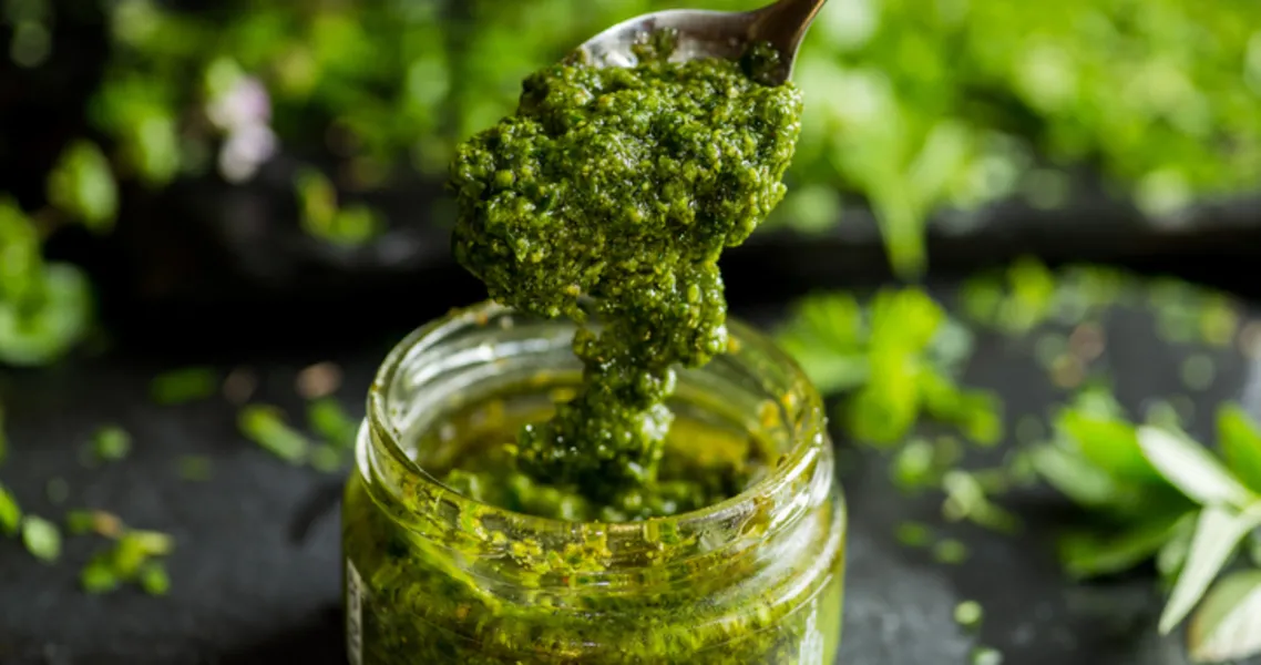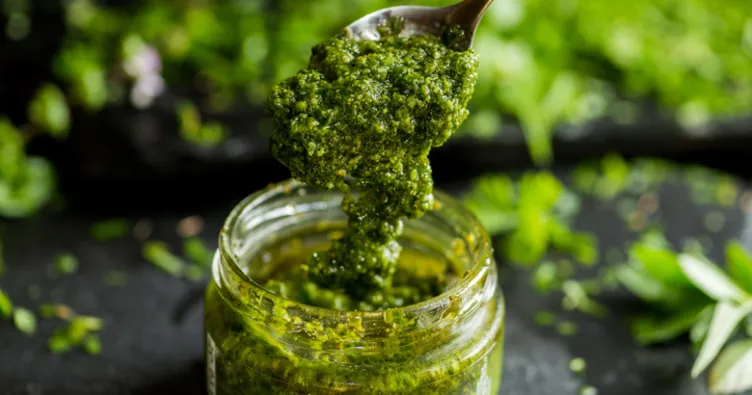 Zeytinyağı ve parmesan peyniri hariç tüm malzemeleri mutfak robotunda çekin. Çekme işlemi devam ederken yavaşça zeytinyağını ekleyin ve pürüzsüz bir kıvam alana kadar çekmeye devam edin. Karışıma parmesan peyniri ekleyip karıştırın. Buzdolabında veya derin dondurucuda hava almayacak şekilde saklayın.