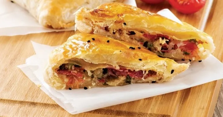 Pastırmayı kıyın ve derin bir kaba alın. Rendelenmiş patates ve parmesan peyniri ile ceviz, dörde bölünmüş kiraz domates, tuz, karabiber ilave edin. Tüm malzemeyi karıştırın. Milföy hamurlarını hafif yumuşaması için 5-6 dakika oda sıcaklığında bekletin. Elinizle incelterek dikdörtgen şekli verin ve orta kısmına pastırmalı harçtan koyun. Çapraz uçları ortada birleştirin ve bohça şekline getirin. Ters çevirip yağlı kağıt serilmiş fırın tepsisine yerleştirin. Diğer milföy hamurlarını da aynı şekilde hazırlayıp üzerlerine yumurta sarısı sürün ve çörekotu serpin. Önceden ısıtılmış 180 derece fırında üzerleri kızarana kadar pişirin.