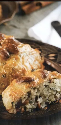 Kuzu gömleğini iyice yıkayıp bir su bardağı sıcak suda 5 dakika bekletin. Gömleği süzgece alıp suyu daha sonra kullanmak üzere saklayın, iç malzeme için karaciğerin zarını soyun. Akciğer ve karaciğeri yıkayıp doğrayın. Ciğerleri tavaya alıp tuz ekleyin. Suyunu salıp çekinceye kadar karıştırarak pişirin. Pirinci yıkayıp süzün. Bir tencerede sıvıyağ ısıtıp dolmalık fıstıkları pembeleşinceye kadar kavurun. Pirinç bir su bardağı sıcak su, kuş üzümü ve tuz ilave edip karıştırın. Suyunu çekinceye kadar pişirip ateşten alın. Taze soğanı ince kıyın ve iç malzeme ekleyip karıştırın. 10 dakika dinlendirdikten sonra ciğer, nane ve karabiberi iç malzemeye ilave edip karıştırın. Kuzu gömleğini 6 parçaya ayırın. Ortalarına iç malzemeden yerleştirip bohça şeklinde kapatın. Ters çevirip hafifçe yassılaştırın ve fırın tepsisine dizin. Üzerine çırpılmış yumurta sürüp iç bademleri dizin. Kuzu gömleğini beklettiğiniz suyu ısıtıp ciğerin sarmalarının üzerine gezdirin. Önceden ısıtılmış 170 derece fırında 40-45 dakika pişirin.