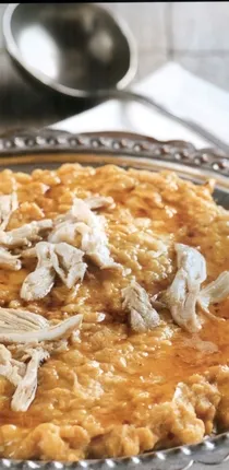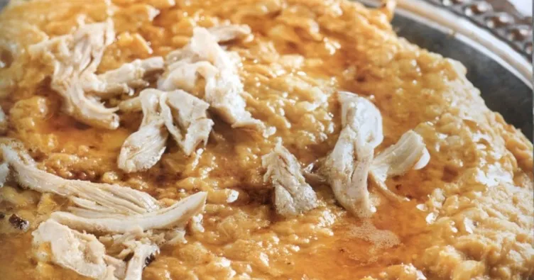 Buğdayı ve nohudu ayrı kaplara alıp, 1 gece öncesinden ıslatın. Ertesi gün sularını süzün ve ikisini büyük bir tencereye alın. Üzerini A parmak geçecek kadar su ekleyerek kaynamaya bırakın [Buğday çok su çektiği için suyu azalırsa sıcak su ekleyin) Buğday ve nohut yumuşayamaya başlayınca tavuk etini, dilimlenmiş soğanı, salçayı, kimyonu ve tuzu da ilave edin. Tüm malzemeler iyice yumuşayıp lapa haline gelince bir tokmak yardımıyla macun kıvamına gelene kadar döverek ezin. Üzeri için erittiğiniz tereyağında toz kırmızı biberi yakın ve yemeğin üzerine gezdirin. Didiklenmiş tavuk etini serpip, sıcak servis yapın.