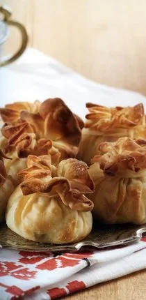 Hamuru hazırlamak için tüm malzemeleri bir yoğurma kabında kulak memesi kıvamını alıncaya ve ele yapışmayana kadar yoğurunuz. Yoğurduğunuz hamurları 15 eşit bezeye bölünüz ve hamuru 15 -20 dakika kadar üzeri ıslak bez ile kapatarak dinlendiriniz. Dinlenen hamurları merdane yardımı ile yuvarlak şekilde açınız. Ortasına ceviz büyüklüğünde harç ilave ederek bir kenarından ortada birleştirrek bohça şeklinde kapatınız. Bohça ları sabitlemek ve açılmasını önlemek için ince şeritli hamur ile bağlayınız. Tüm bohçaları altı yağlanmış bir tepsiye dizerek üzerini tereyağı ile yağlayınız.180 derece fırında 15-20 dakika kızarana kadar pişiriniz.