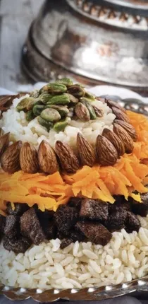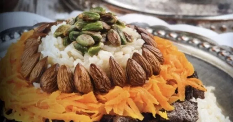 Öncelikle pirinci tuzlu ılık suda 15 dakika bekletin ve süzün. Bol suyla yıkadıktan sonra süzülmesi için bir kenara alın. 2 çorba kaşığı tereyağını eritin ve kıyılmış soğanı kavurun. Et suyunu ilave edin ve kaynayınca tuzunu ayarlayın ve pirinci katın. Tencerenin ağzı kapalı olarak, kaynayana dek harlı sonra kısık ateşte suyunu çekene kadar pişirin. Diğer taraftan eti 1 çorba kaşığı tereyağında kavurun. Jülyen doğranmış havuç, badem ve antepfıstığını ayrı ayrı tavalarda 1 'er tatlı kaşığı tereyağında kavurun. Servis tabağına önce pilavı alın, üzerine sırasıyla et, havuç, badem ve antepfıstığını yerleştirin. Sıcak olarak servis yapın.