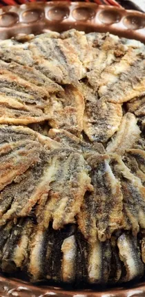 Hamsiyi ayıklayın ve kılçıklarını çıkarın. Bol su ile yıkayın ve süzün. Hamsilerin bir kısmını orta boy bir fırın kabına dibini ve kenarlarını kaplayacak şekilde yerleştirin. Bir tencereye aldığınız zeytinyağında dolmalık fıstığı kavurun. Kuş üzümü, yıkanıp süzülmüş pirinç, kıyılmış dereotu, tuz, yenibahar ve naneyi ilave edip karıştırın. Suyunu katın ve önce harlı sonra kısık ateşte suyunu çekene kadar pişirin. Piştikten sonra 10 dakika dinlendirin ve daha sonra tencereye dizdiğiniz hamsinin ortasına boşaltın. Pilavın üzerini kalan hamsi ile kapatın. Önceden ısıtılmış 180 derece fırında 40-45 dakika pişirin. Sıcak servis yapın.