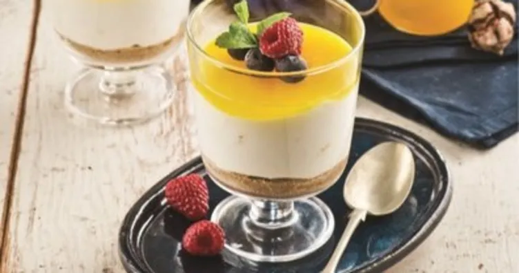Bir kapta bisküvileri un haline gelene dek dövelim. İçine erimiş margarini, sütü ekleyerek hamur haline gelene dek karıştıralım. Bİsküvi hamurunu köşeli bir kalıba bastırarak yerleştirelim. Krem şantiyi süt ile çırparak koyulaştıralım. Jöleyi 1/2 bardak sıcak su ile eritelim. Jöle soğuduğunda içine pudra şekerini, krem şantiyi ve labne peyniri ekleyerek mikserle 1 dk. çırpalım. Kremayı bisküvi hamuru üzerine yayarak dilimlenmiş meyveleri kremanın üzerine dizelim. Tencereye suyu, nişastayı ve şekeri alalım. Ağır ateşte ve sürekli karıştırarak üzeri göz göz olana dek pişirelim. Sosu ateşten alıp soğutarak meyvelerin üzerine gezdirelim. Buzdolabında birkaç saat beklettikten sonra servis yapalım.