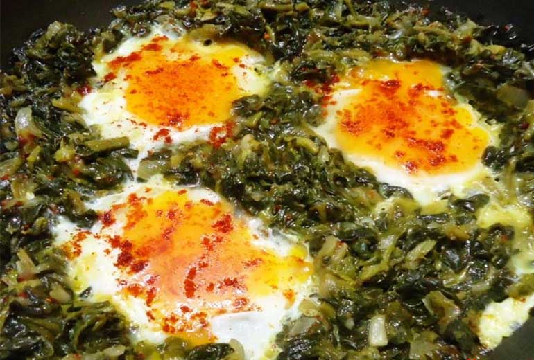 Ispanakları güzelce yıkıyoruz sirkeli suda 15-20 dakika bekletiyoruz. Ispanakları ve soğanları doğruyoruz. Soğanları sıvı yağda kavuruyoruz ardından ıspanakları ekleyip tuzunu ilave ediyoruz. 20-25 dakika içinde pişmiş olacaktır. Yumurtaları belirli yerlere kırıyoruz kapağını kapatıp pişmesini bekliyoruz. Üzerine karabiberini döküyoruz. Afiyet olsun
